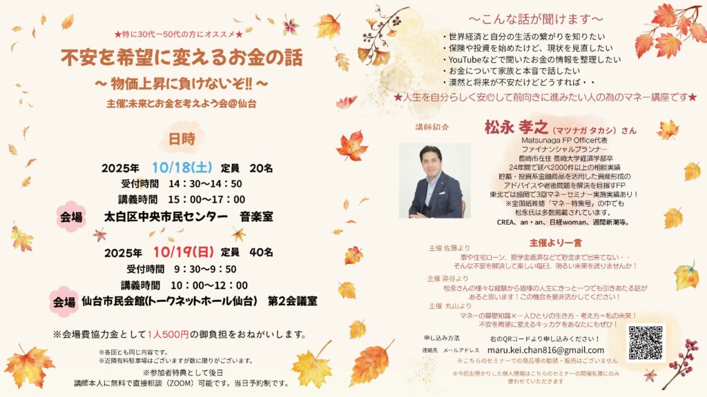 未来とお金を考えようの会@仙台様による【不安を希望に変えるお金の話〜物価上昇に負けないぞ!!〜】に講師として参加します! -
